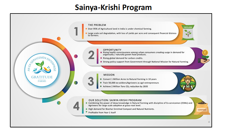 This is where Gratitude Farms aims to step in with its flagship initiative: the Sainya-Krishi Program. This program is not merely about farming; it’s about empowerment, sustainability, and a commitment to a healthier future for India, with ex-servicemen as rural micro-entrepreneurs to drive the change towards natural farming.